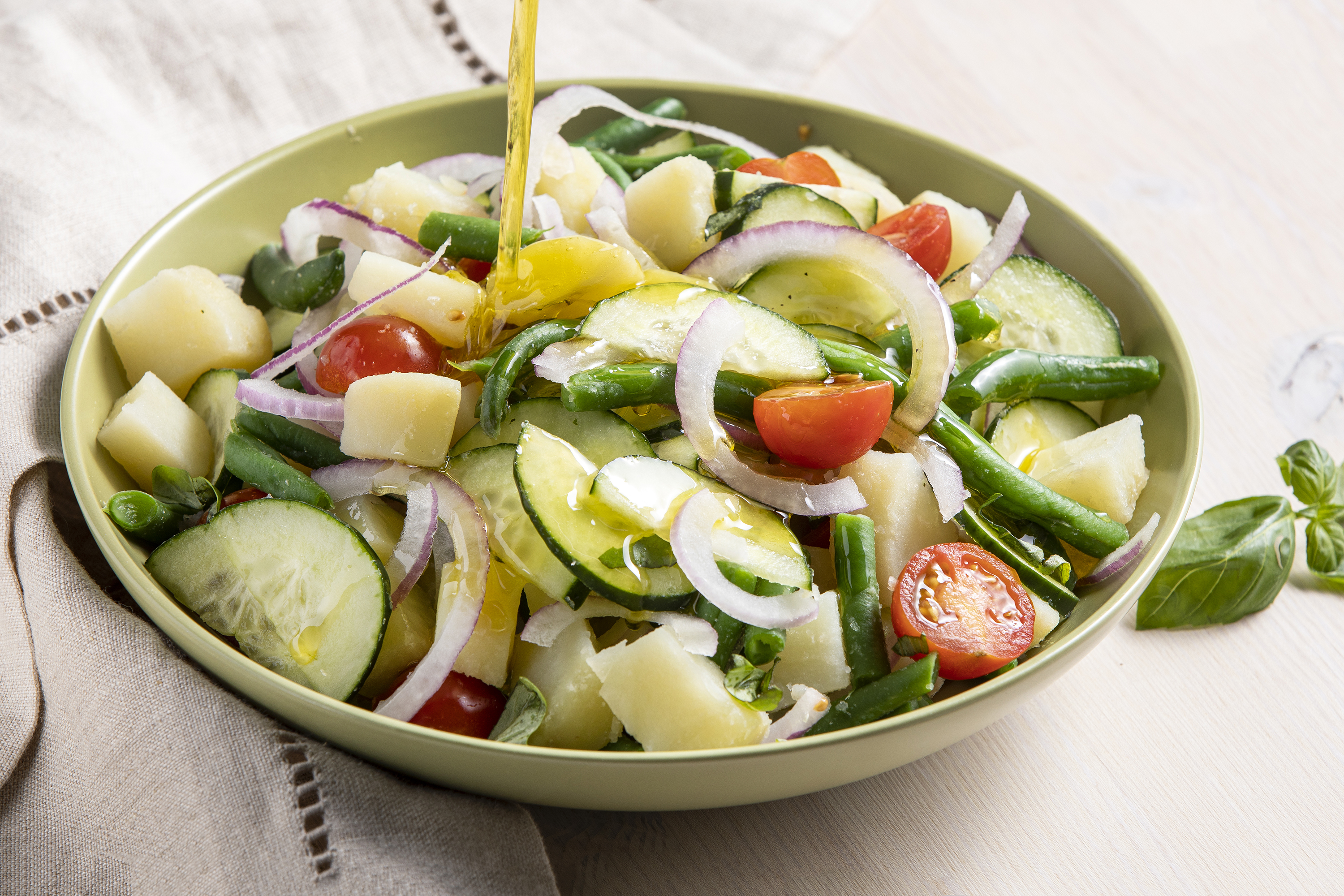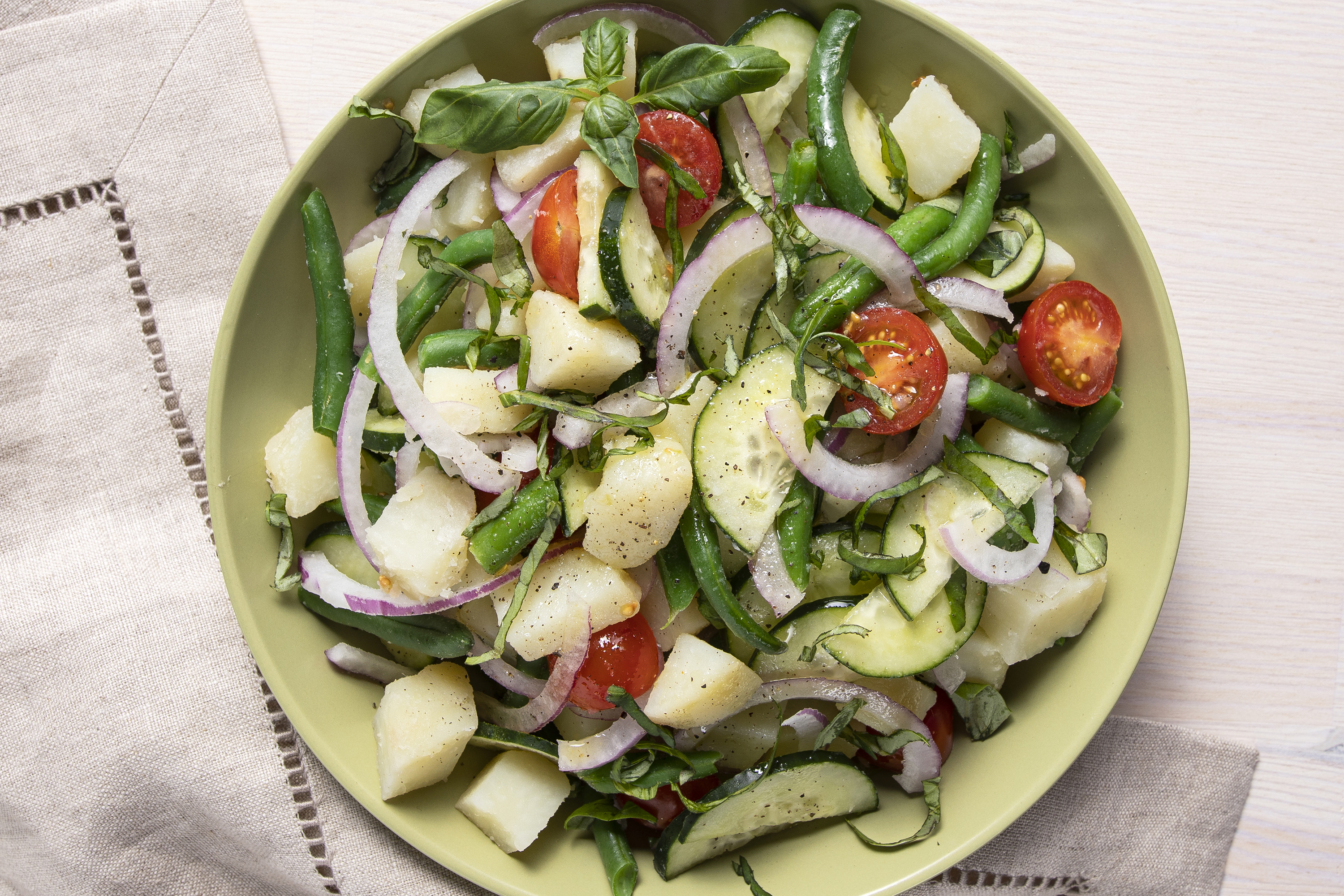 No matter where or when the potluck arises, you know you need to bring a potato salad. But not just any potato salad: 5-Star Potluck Salad is the only option! Why? Well, tender potatoes and green beans with a vibrant mixture of veggies and a sprinkling of refreshingly fragrant basil are always a hit! All that comes with a smooth, tangy dressing to really bring it all together. It may seem simple, but this 5-Star Potluck Salad brings a potluck of flavors!