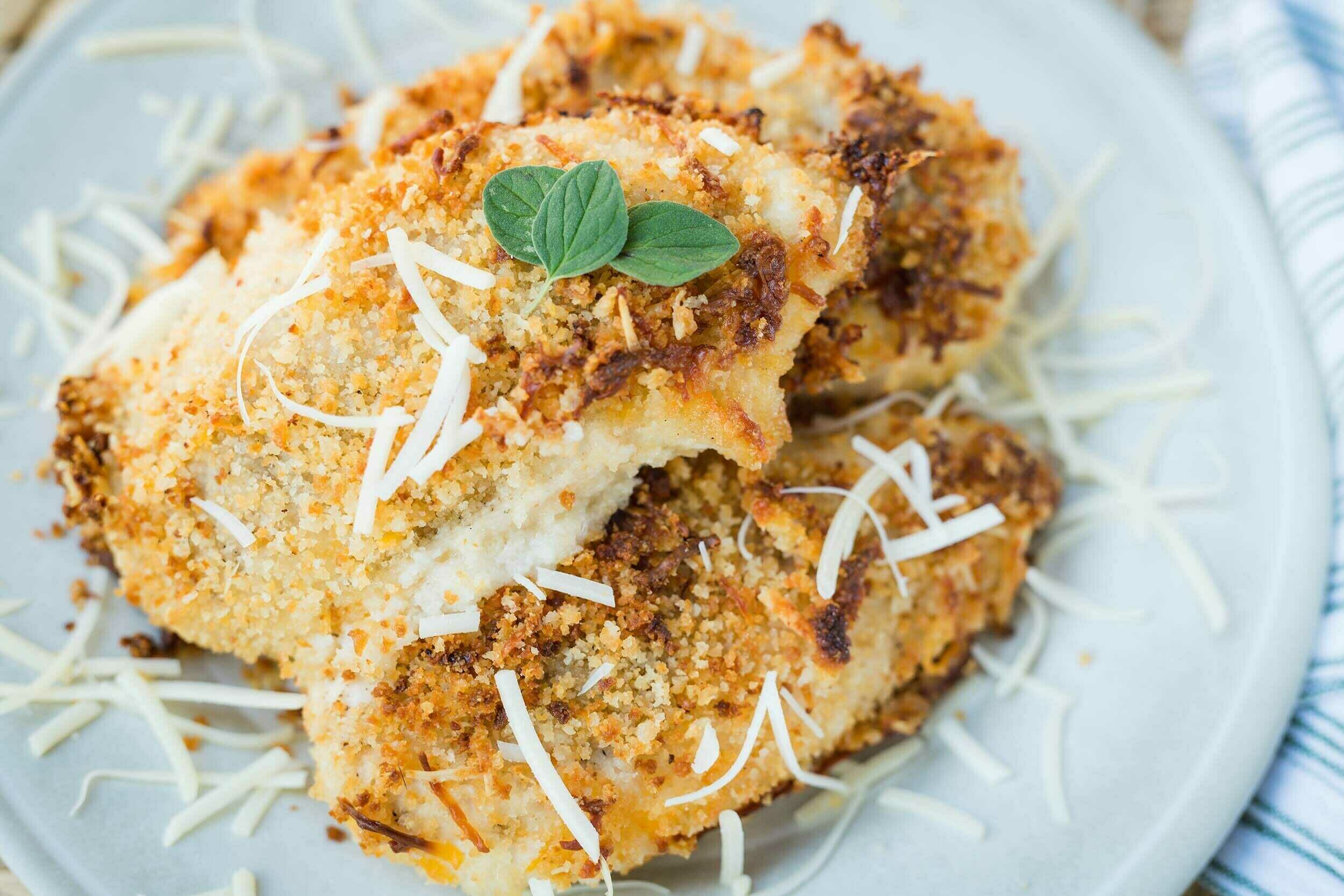 Step 10 -Sprinkle the top of the chicken with any excess breadcrumbs, pressing lightly to help them adhere.