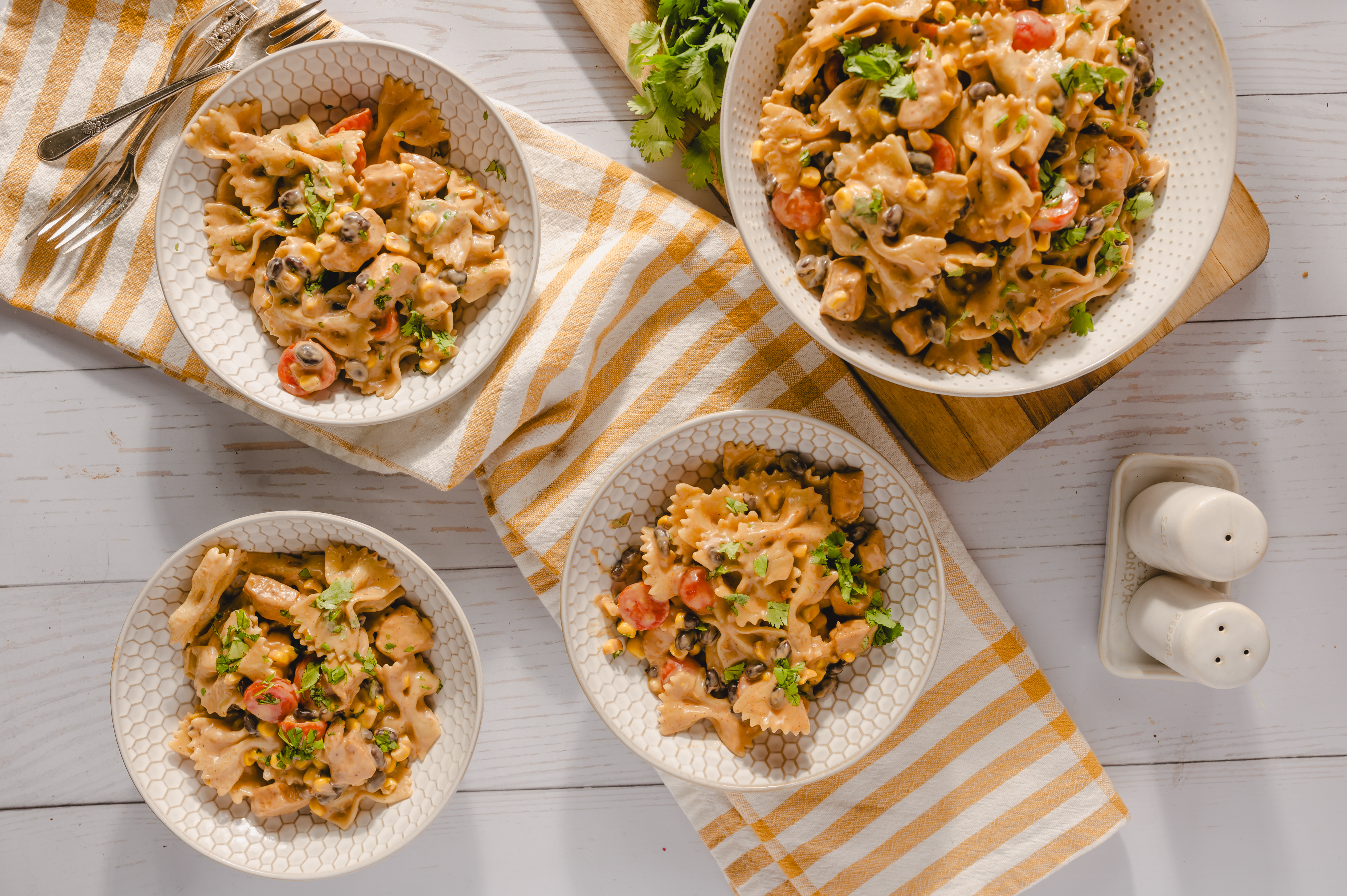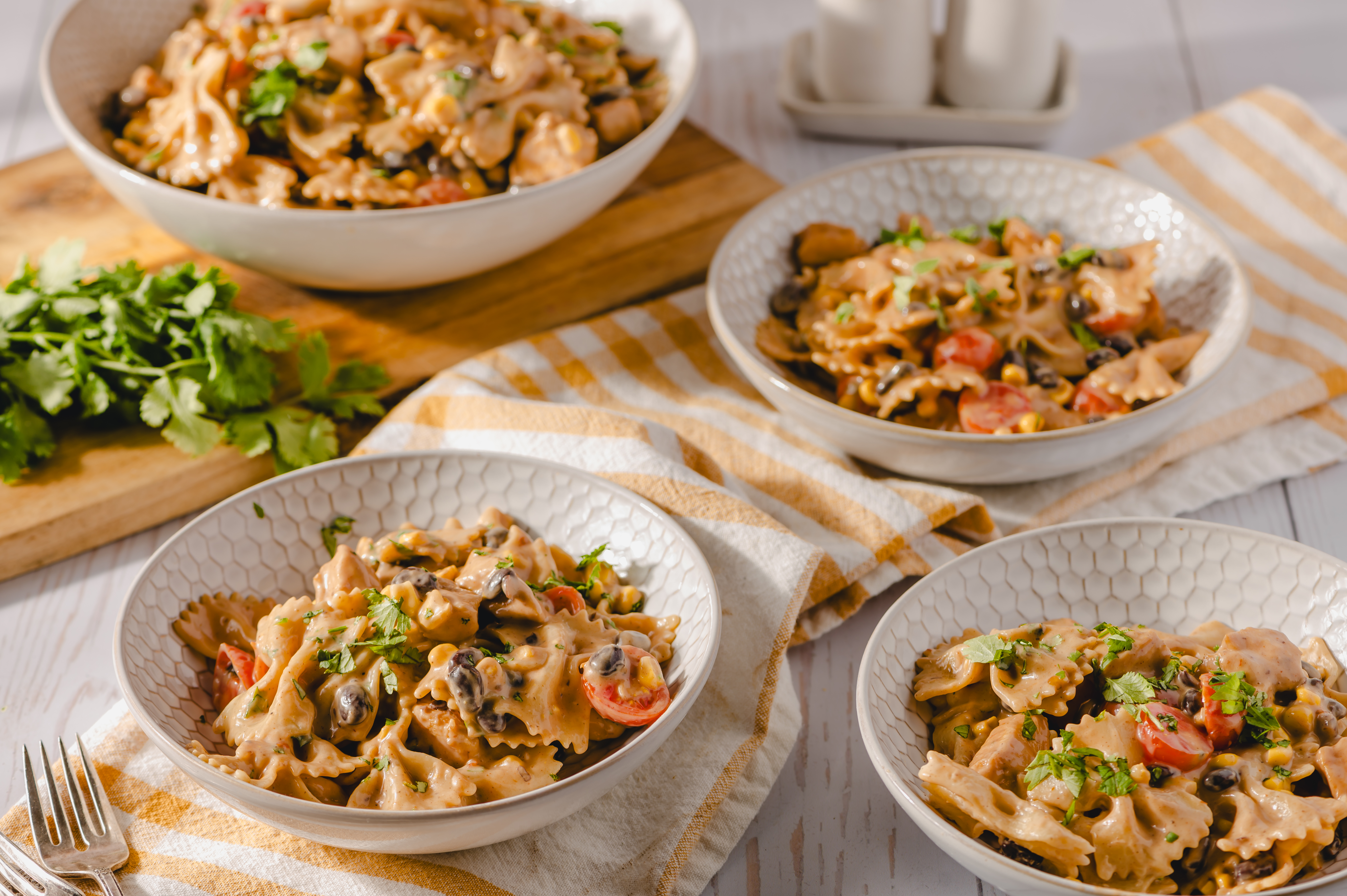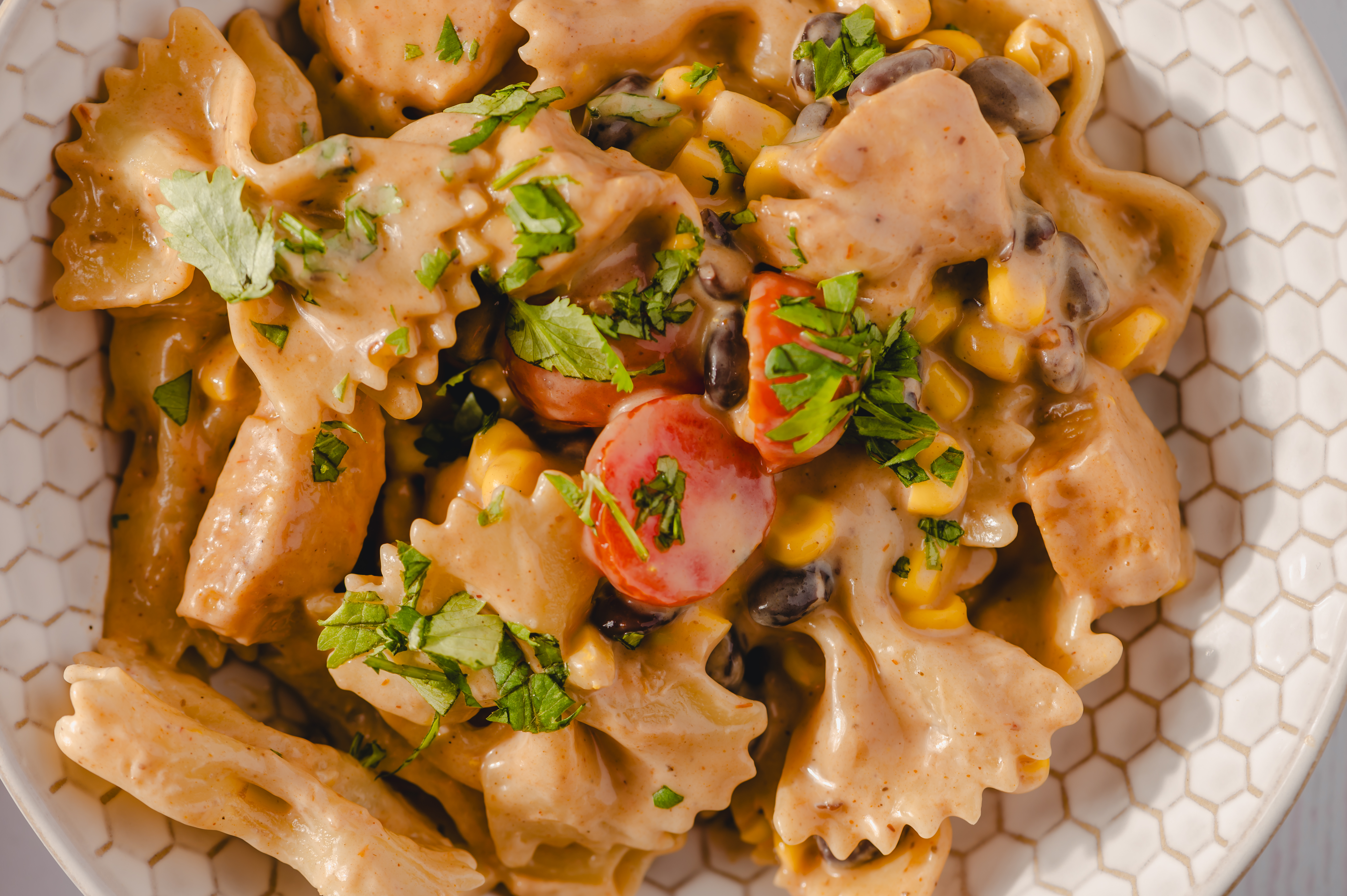 Step 5 -In a large mixing bowl, add the barbecue chicken pieces, the pasta, the remaining barbecue sauce, the ranch dressing, the tomatoes, the corn, the beans, and 1/4 cup of the cilantro and toss gently to combine.