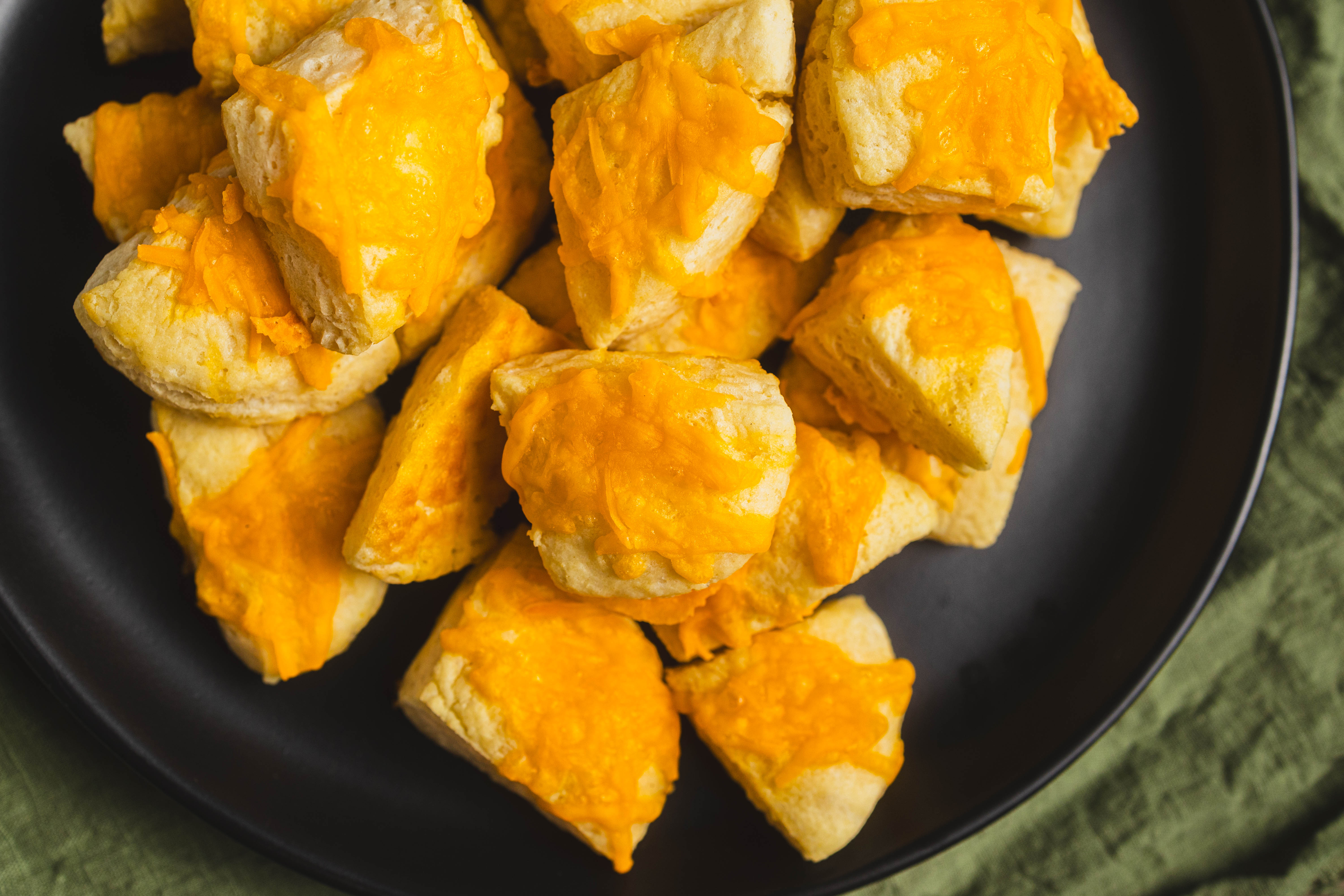 Cheesy, easy, and loved by all... just a brief description of what Cheesy Wedges will mean to you! Buttery biscuits, cut into quarters and brushed with melted butter for even more richness, are topped with an abundance of sharp cheddar cheese. When they're baked until golden and melty from the oven, Cheesy Wedges will become the (very much) expected favorite side for all your family gatherings. It's so easy, it's cheesy!