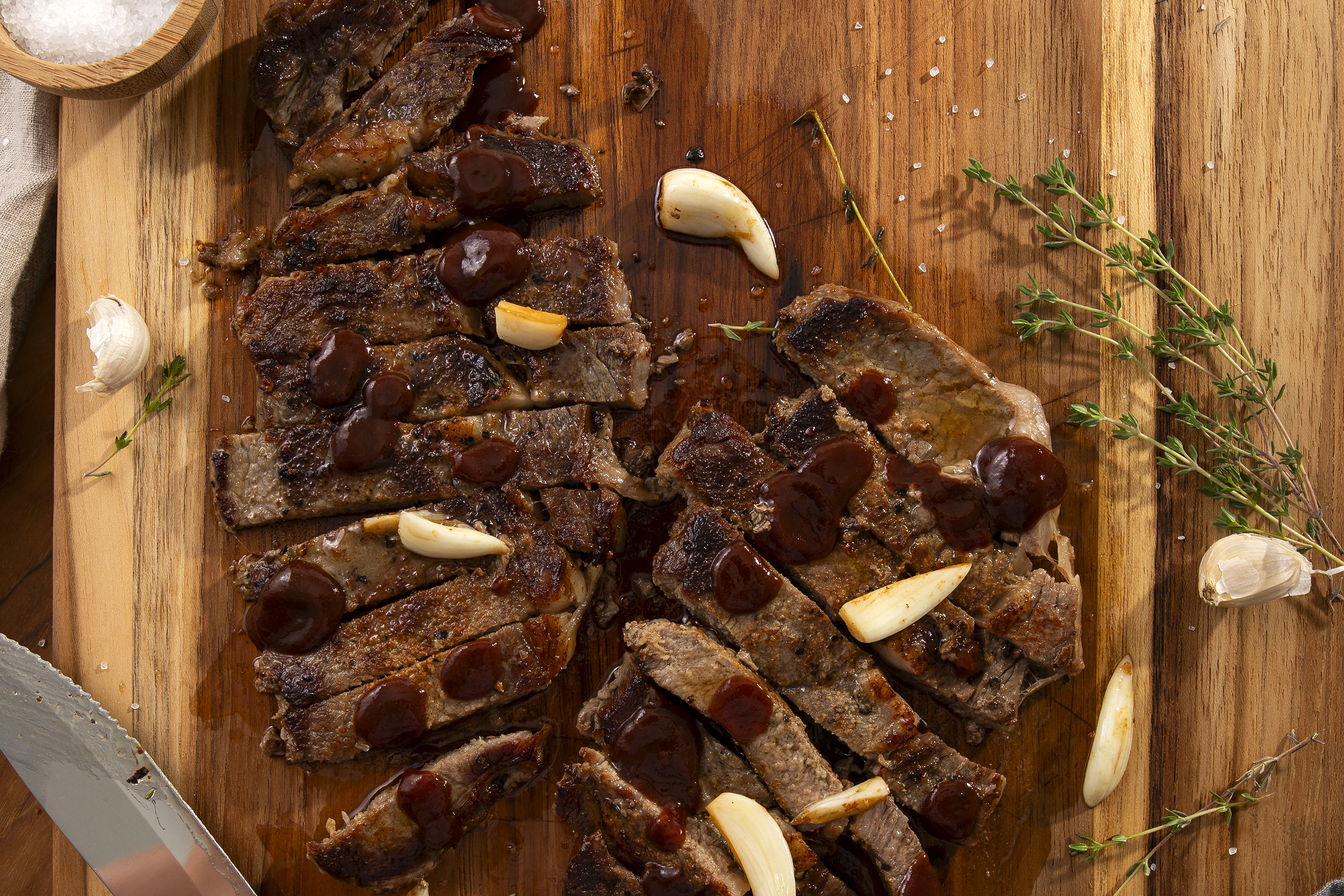 Step 8 -Add the butter, the garlic cloves, and the thyme sprigs beside the steaks in the pan.