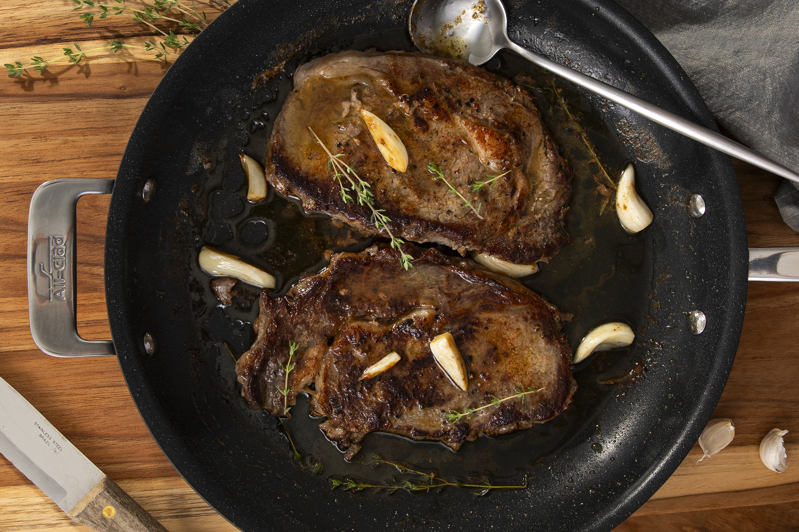 Step 9 -Slightly tilt the pan so the melted butter pools and continually spoon it over the steaks until the steaks reach an internal temperature of at least 130 degrees F for medium-rare, about 1-2 minutes.