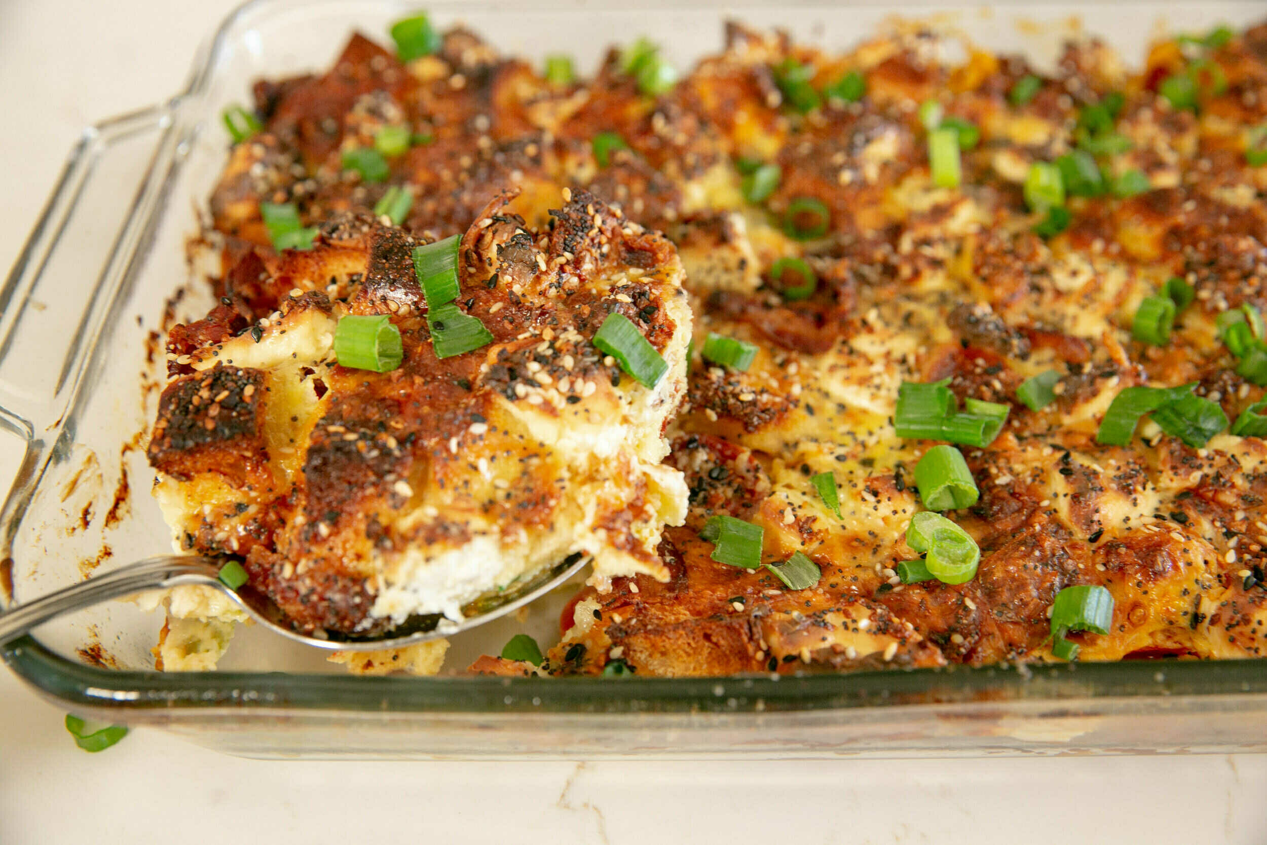 Step 6 -Add the pieces of the cream cheese evenly over the egg mixture, then sprinkle the casserole with the everything bagel seasoning.
