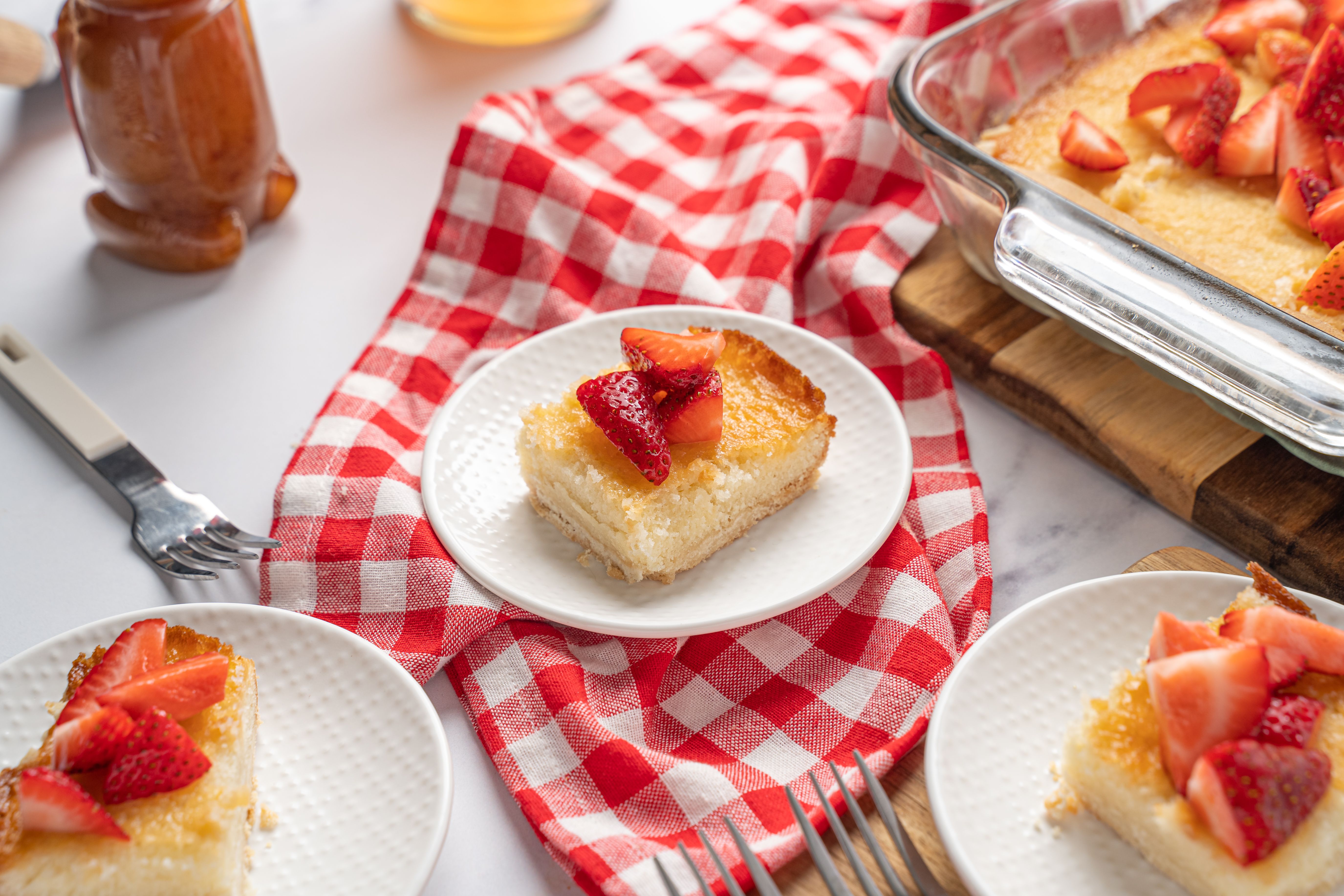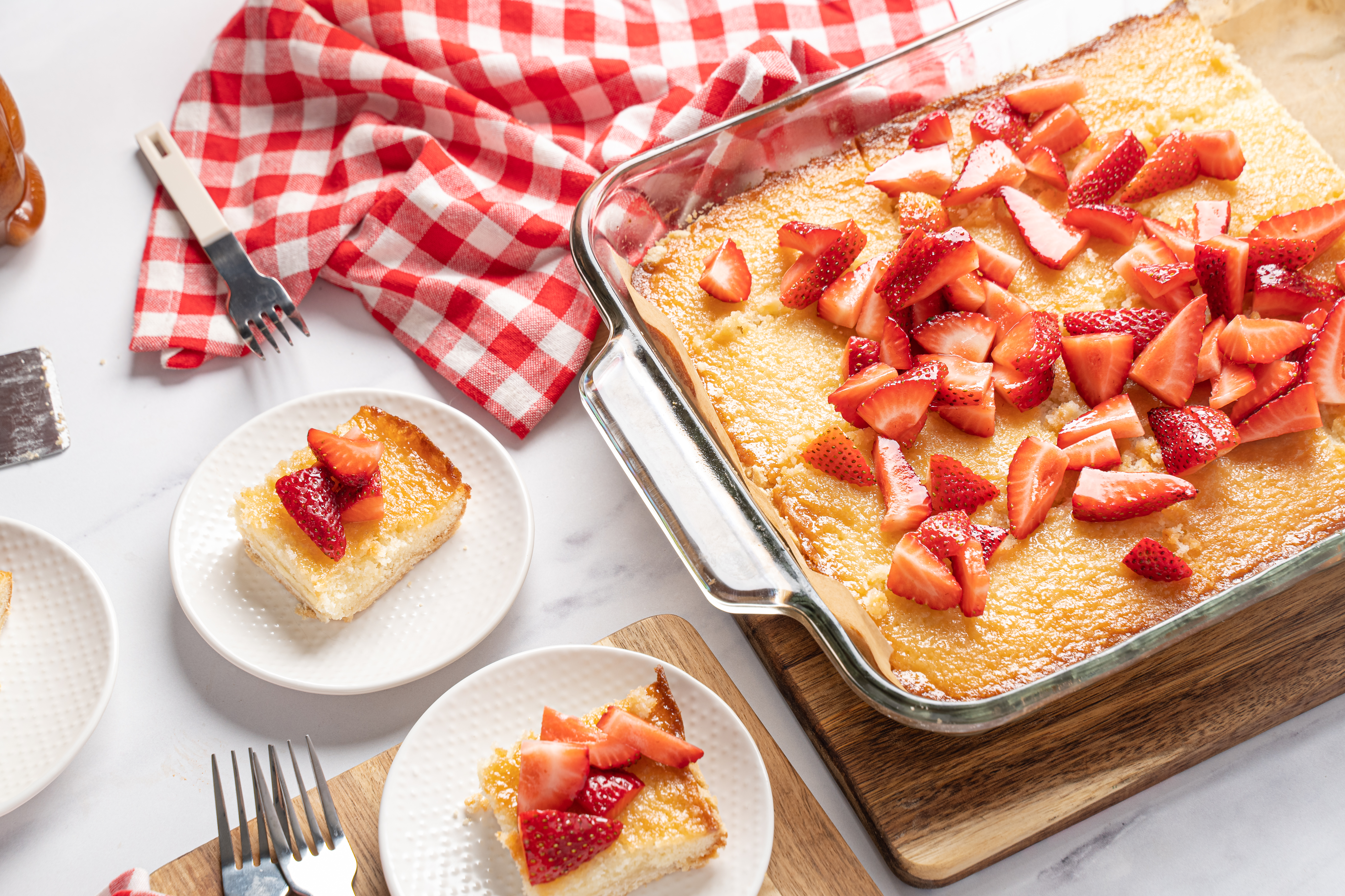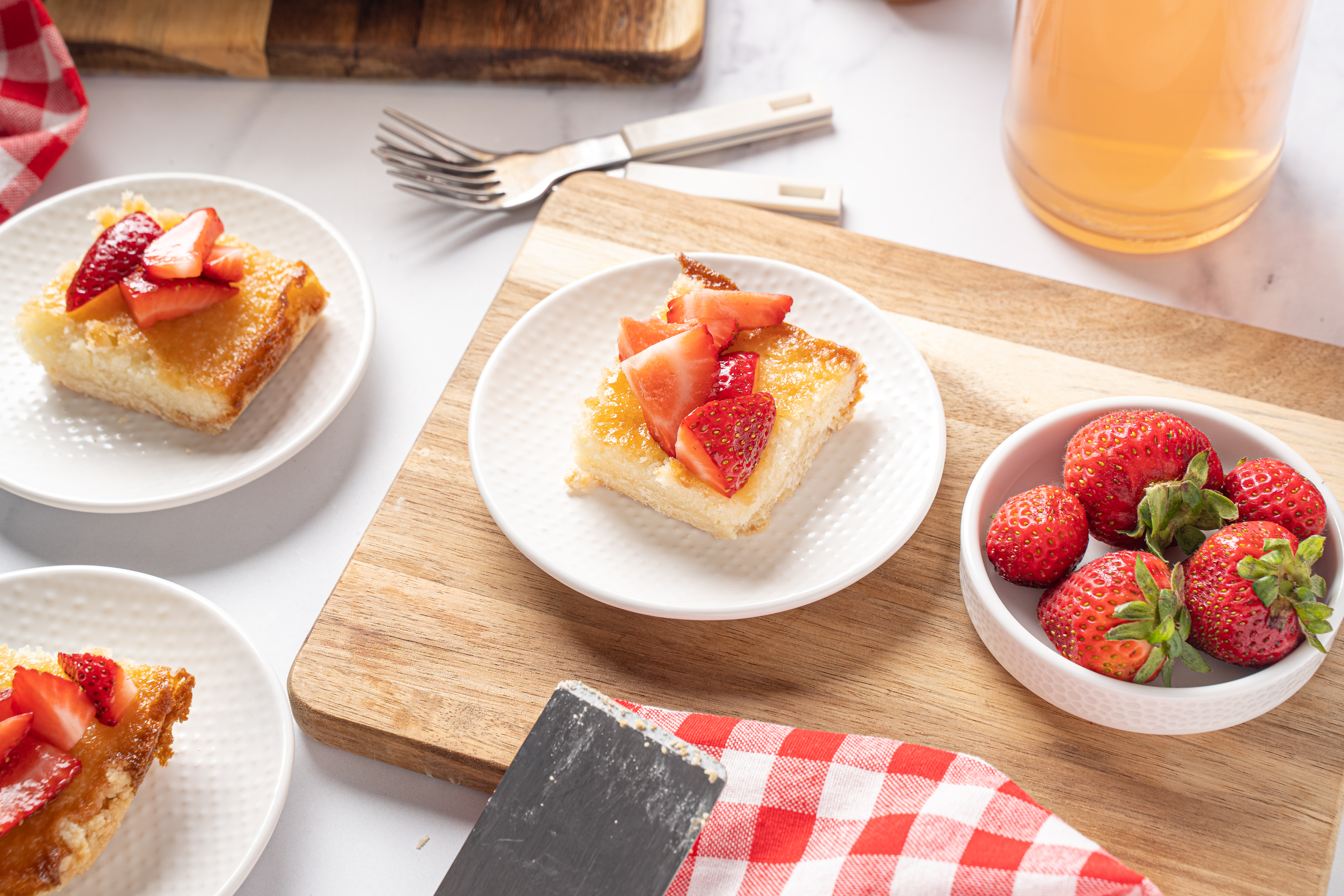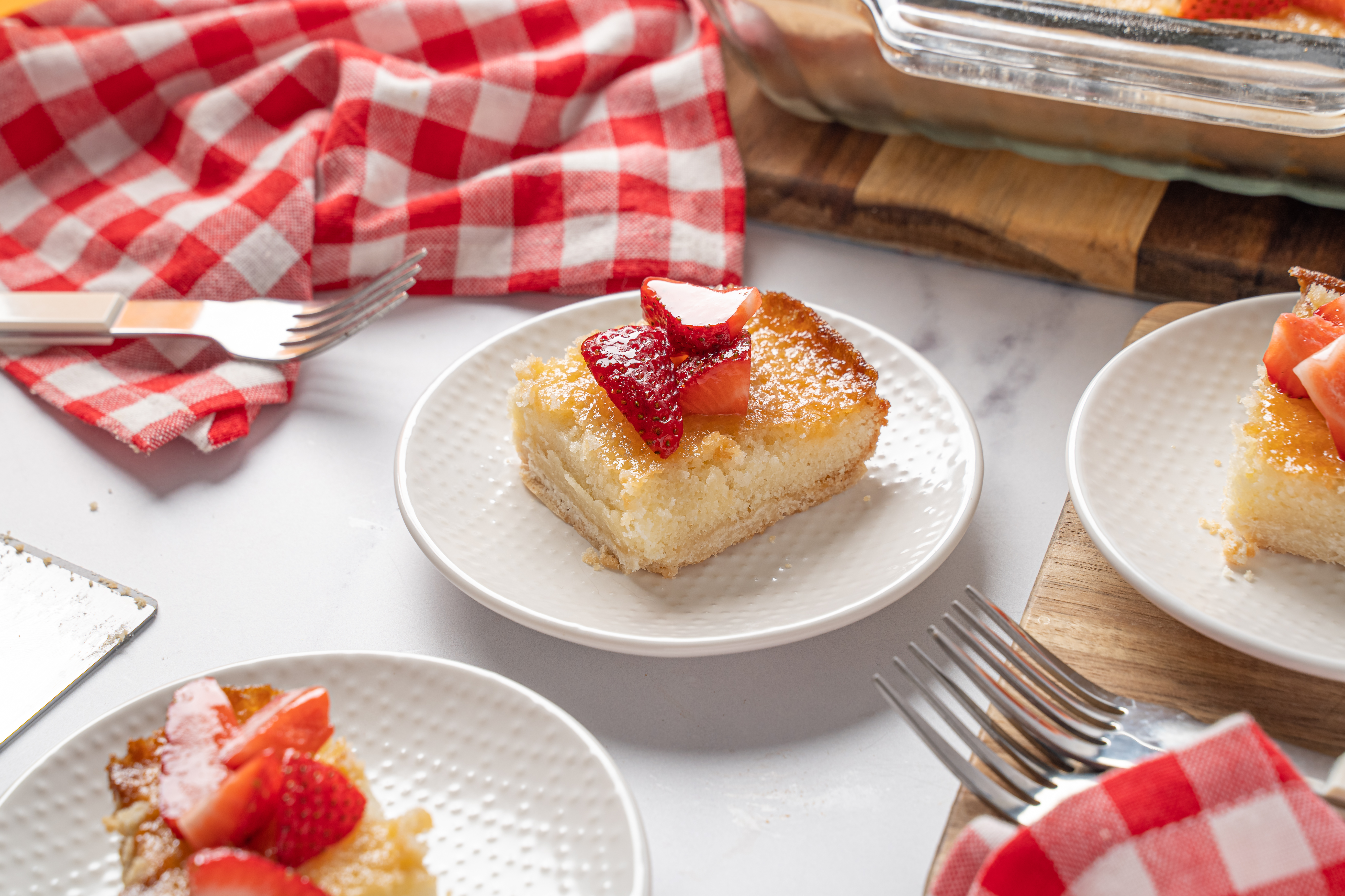 Listen to that sweet tooth... you deserve a treat! Can't decide what to choose? Might we suggest these Gooey Butter Bars? They taste just the way they sound. Each bite is filled with some caramel-y, buttery goodness in a savory yet sweet crust. In the mood for some fruit, too? Well, these Gooey Butter Bars taste the best with some juicy strawberries sprinkled over the top. You know you need this delightful experience, right?! Just do it; give in and treat yourself!