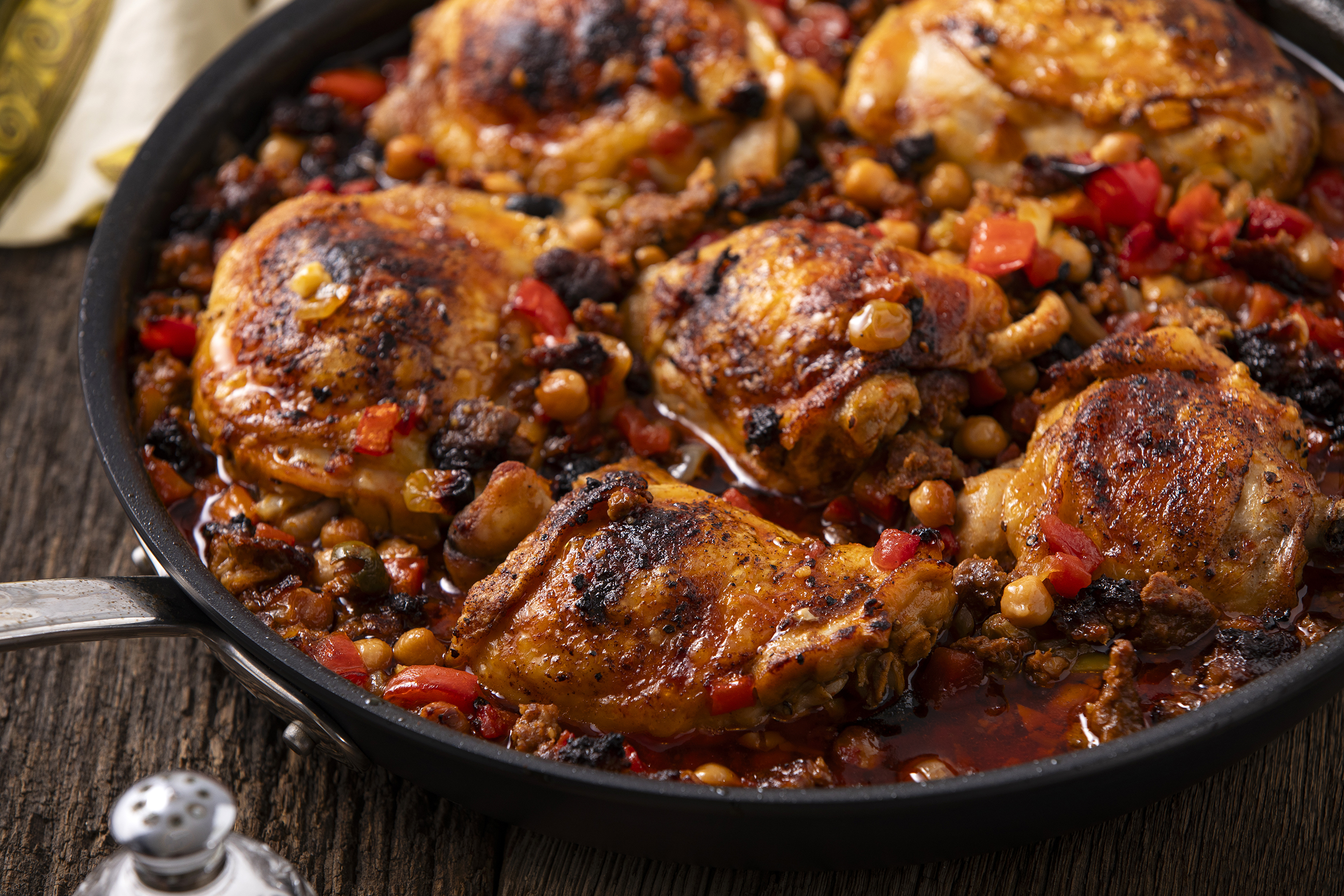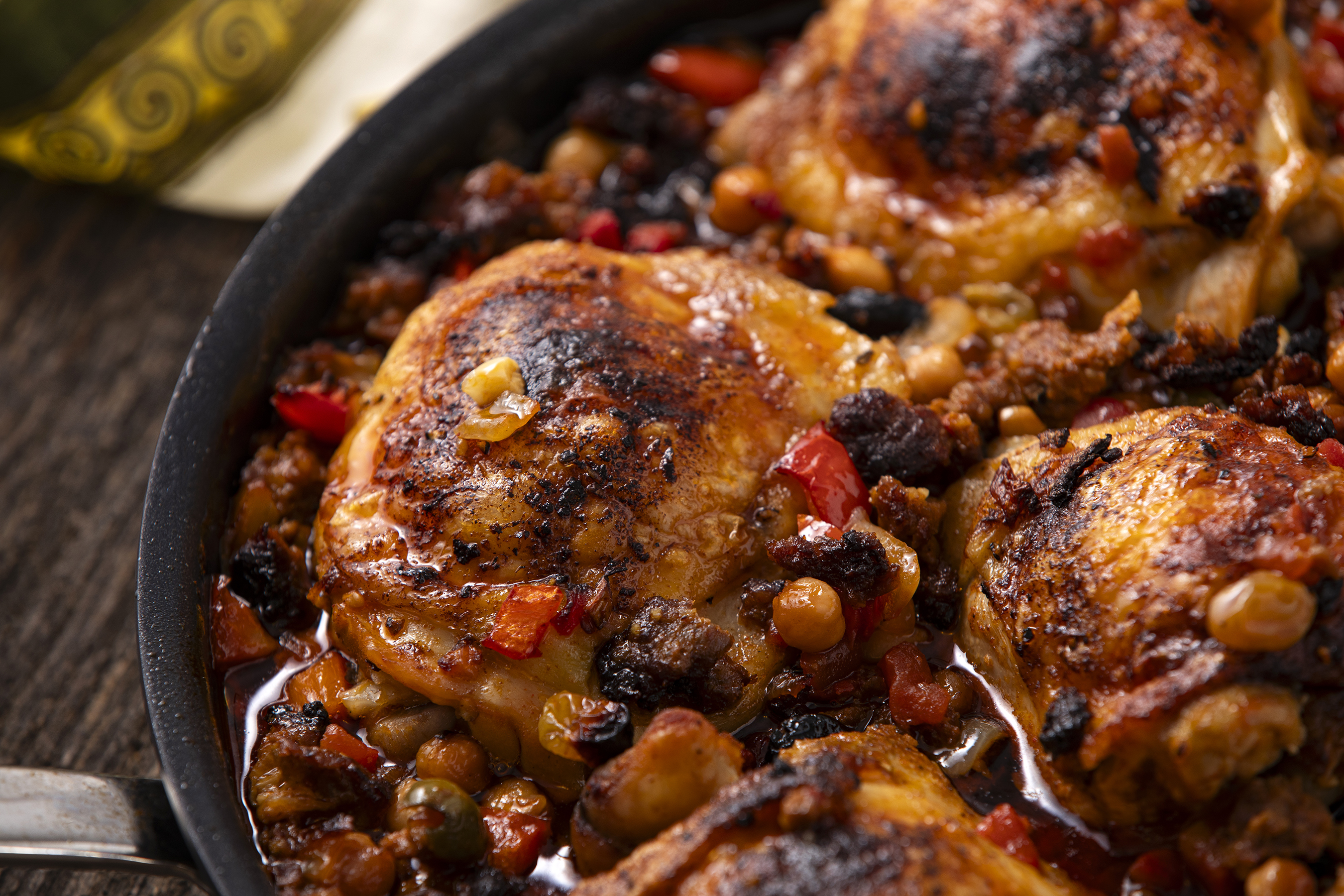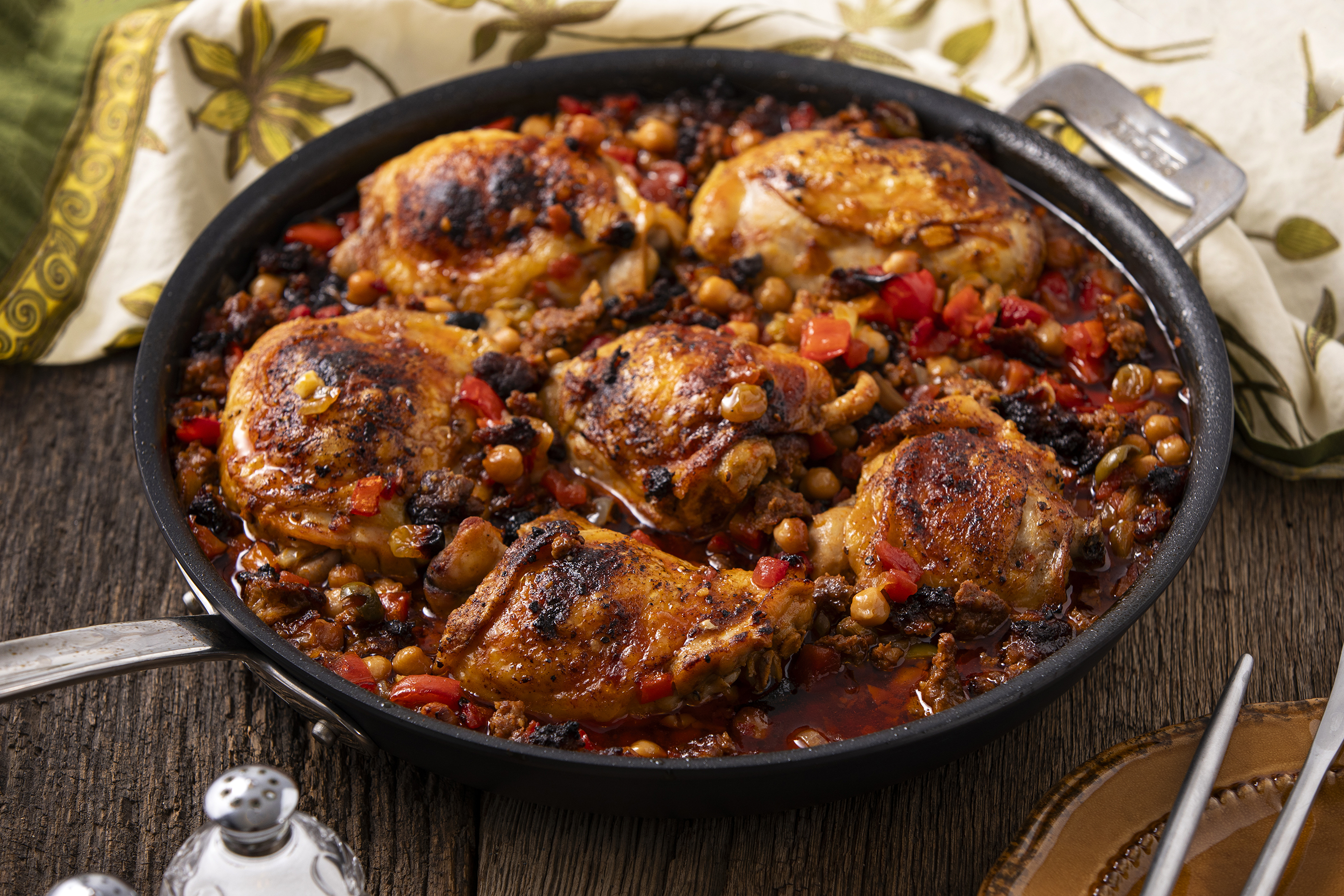 Homestyle Spanish Chicken is absolutely incredible! It's loaded with all sorts of goodies, like juicy veggies, sweet raisins, and savory seasonings. It really brings some fun to your standard chicken dinner. And... there truly isn't anything standard about this delicious dish other than the fact that it's super easy and only requires one skillet. Homestyle Spanish Chicken is extremely tasty and simple to make. You've found yourself a winner-winner!