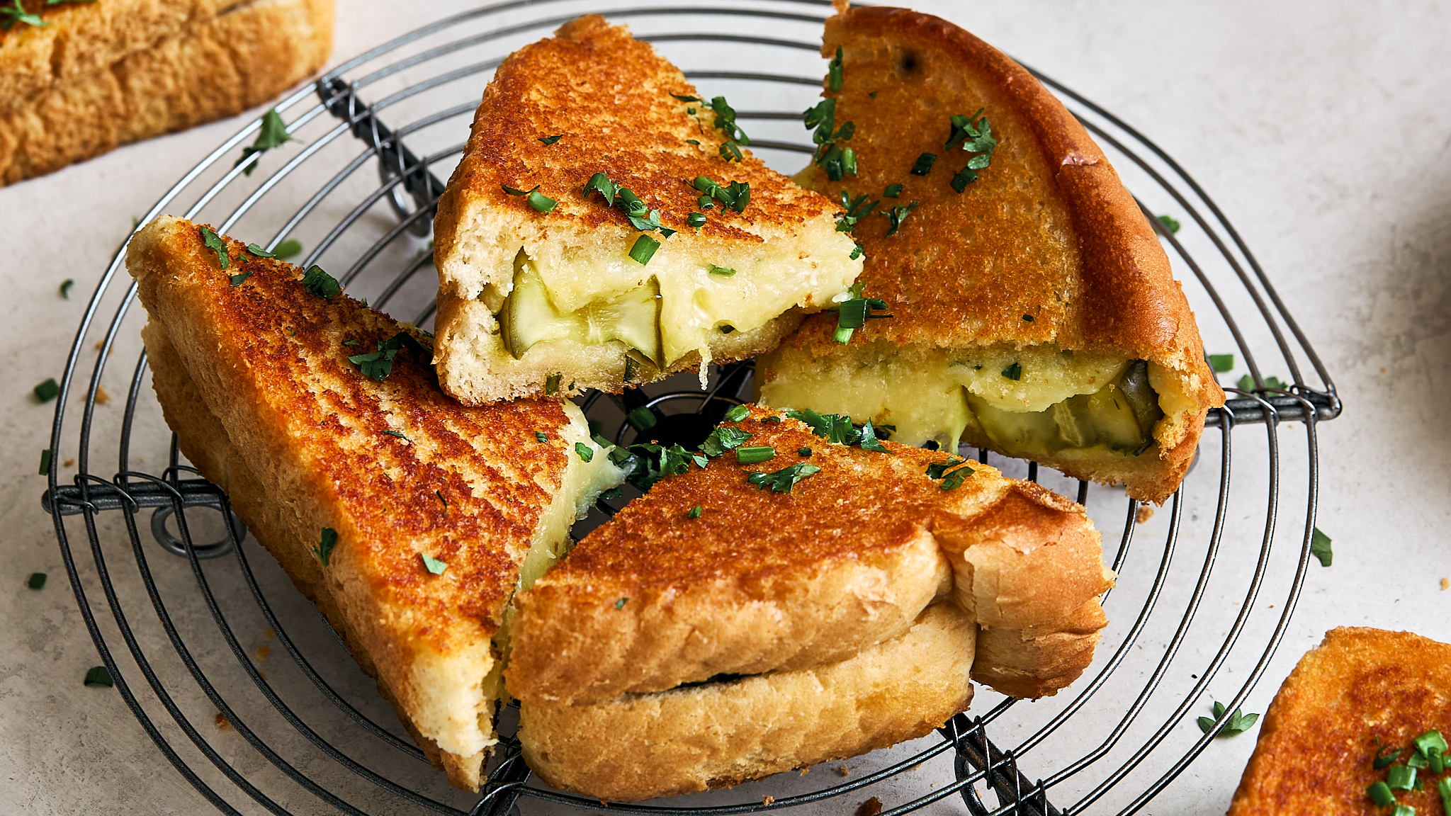 Gold and green are the colors of this Irish Cheddar Grilled Cheese, so you can see at a glance the delicious flavors on display. The outside is golden, buttered toast, while the inside features emerald, sour pickles, melty, golden sharp Irish cheddar, and bands of floral green herbs! There's even aromatic herb-butter on the inside of Irish Cheddar Grilled Cheese for a combination of gold and green you just can't beat! You'll never go back to regular grilled cheese after this!