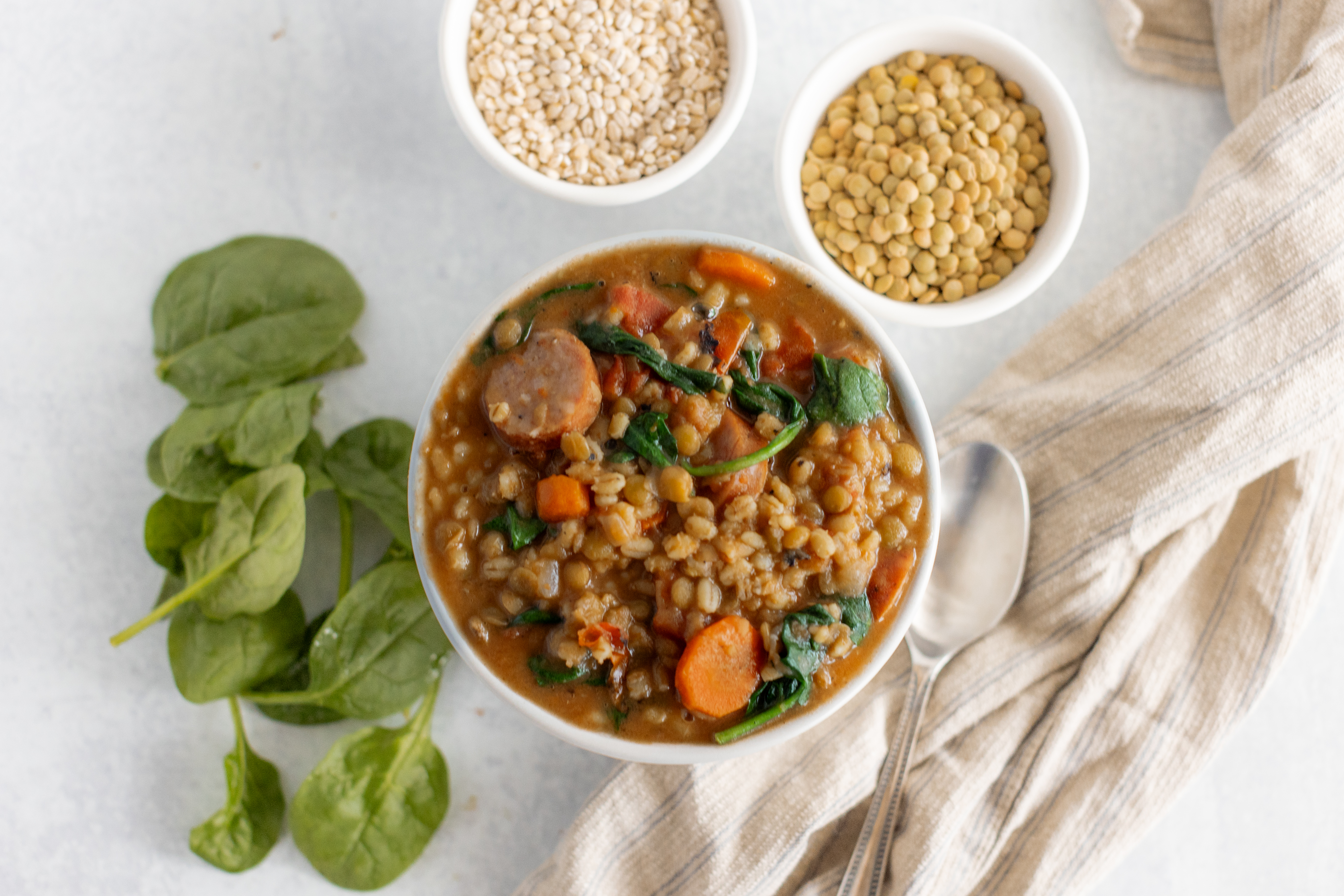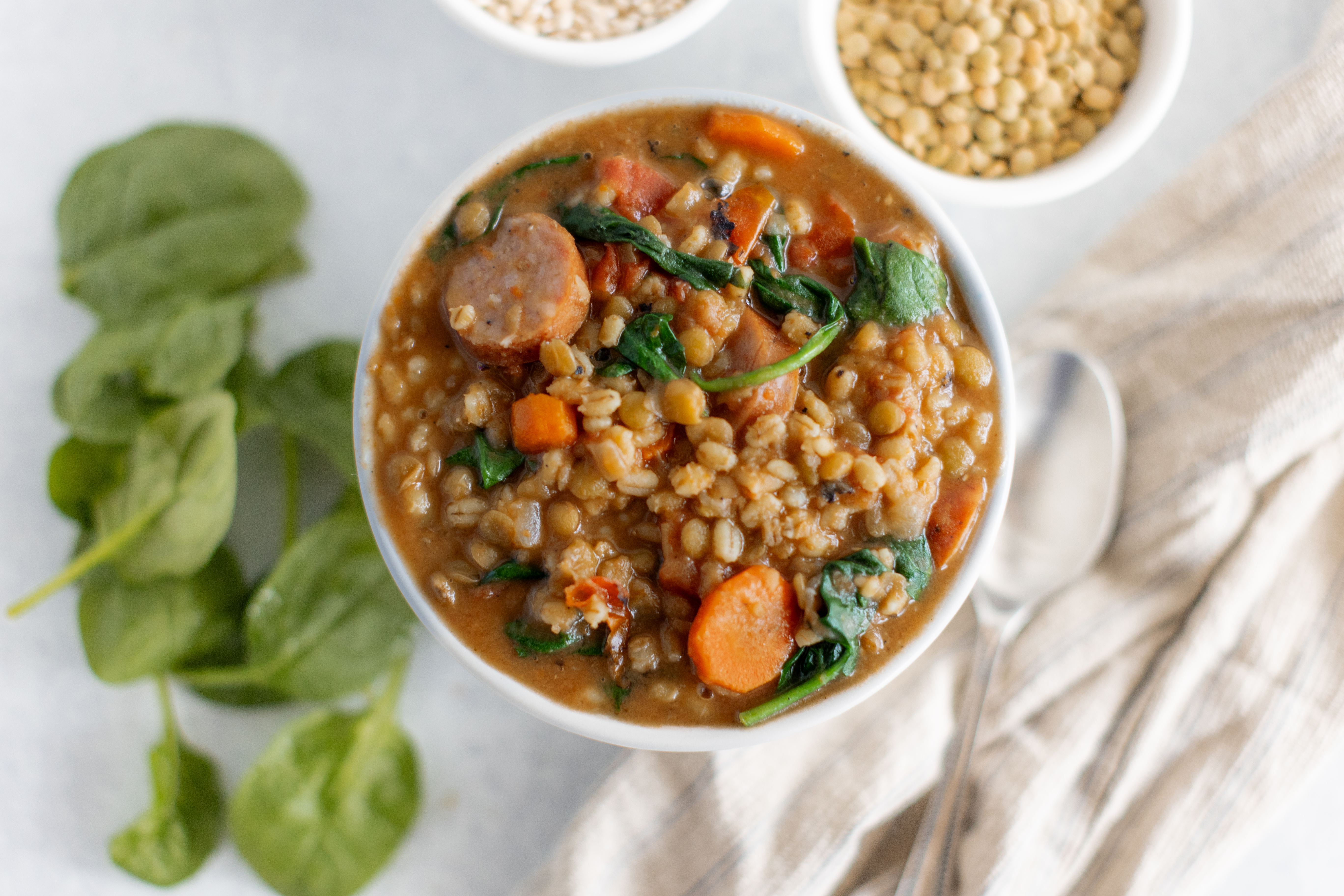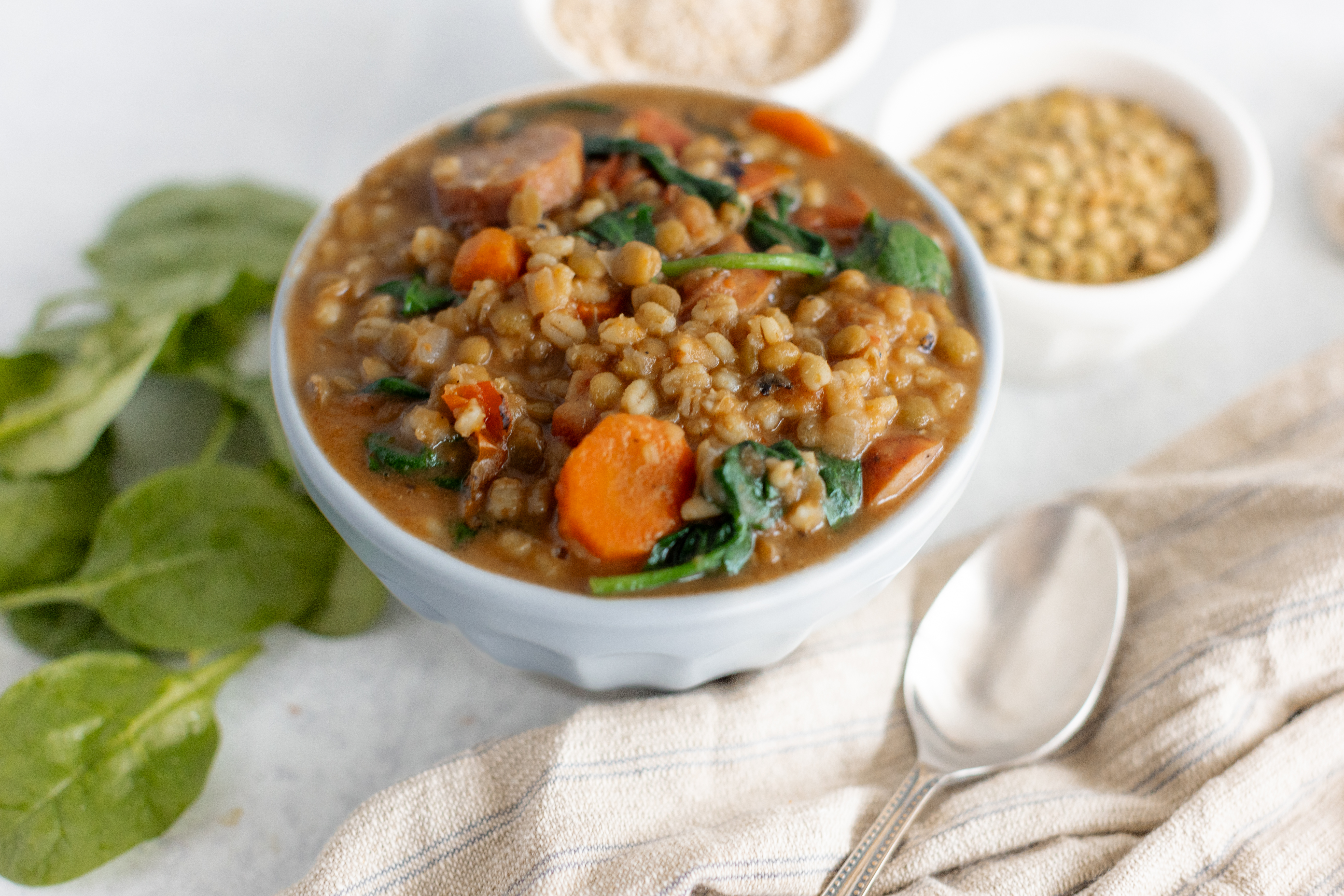 Cheers to the chef for this chef's kiss of a creation! Lovers Sausage Soup is a hearty combination that will hug you from the inside out! Tender barley, sweet carrots, and bountiful lentils are joined with fire-roasted tomatoes, chicken-apple sausage, and wilted spinach in a flavorful broth for a forever match made in soup heaven. We have only heart-eyes for Lovers Sausage Soup, and we aren't afraid to shout it from the bowl rims! We love it!