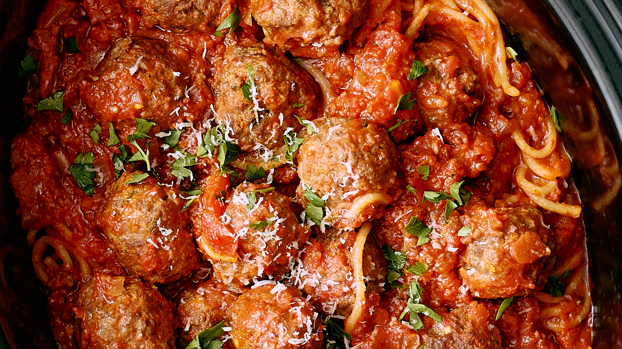 It's Slow Cooker Pasta! What more do you need? The meatballs are obviously juicy and perfectly cooked, all that beefy, parmesan-infused goodness in sphere form! The pasta is cooked to tenderness in a rich and spicy tomato sauce! And you have to do very little to make it happen! Slow Cooker Pasta makes pasta night easy! It really is that simple!