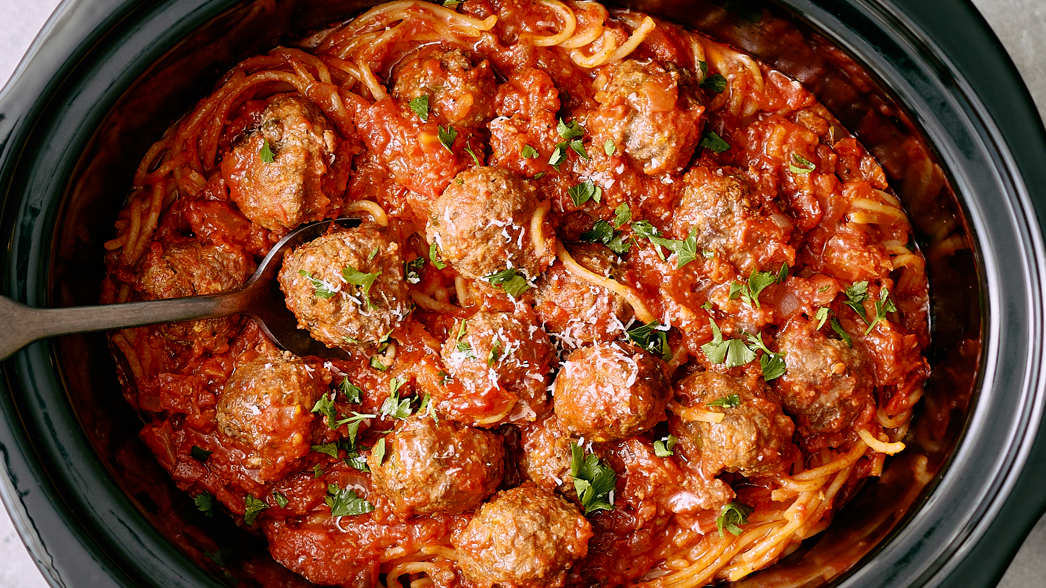 Step 9 -Cover the slow cooker and cook on low, while stirring halfway through, until the spaghetti is tender and the meatballs reach an internal temperature of 160 degrees F, about 45 minutes.
