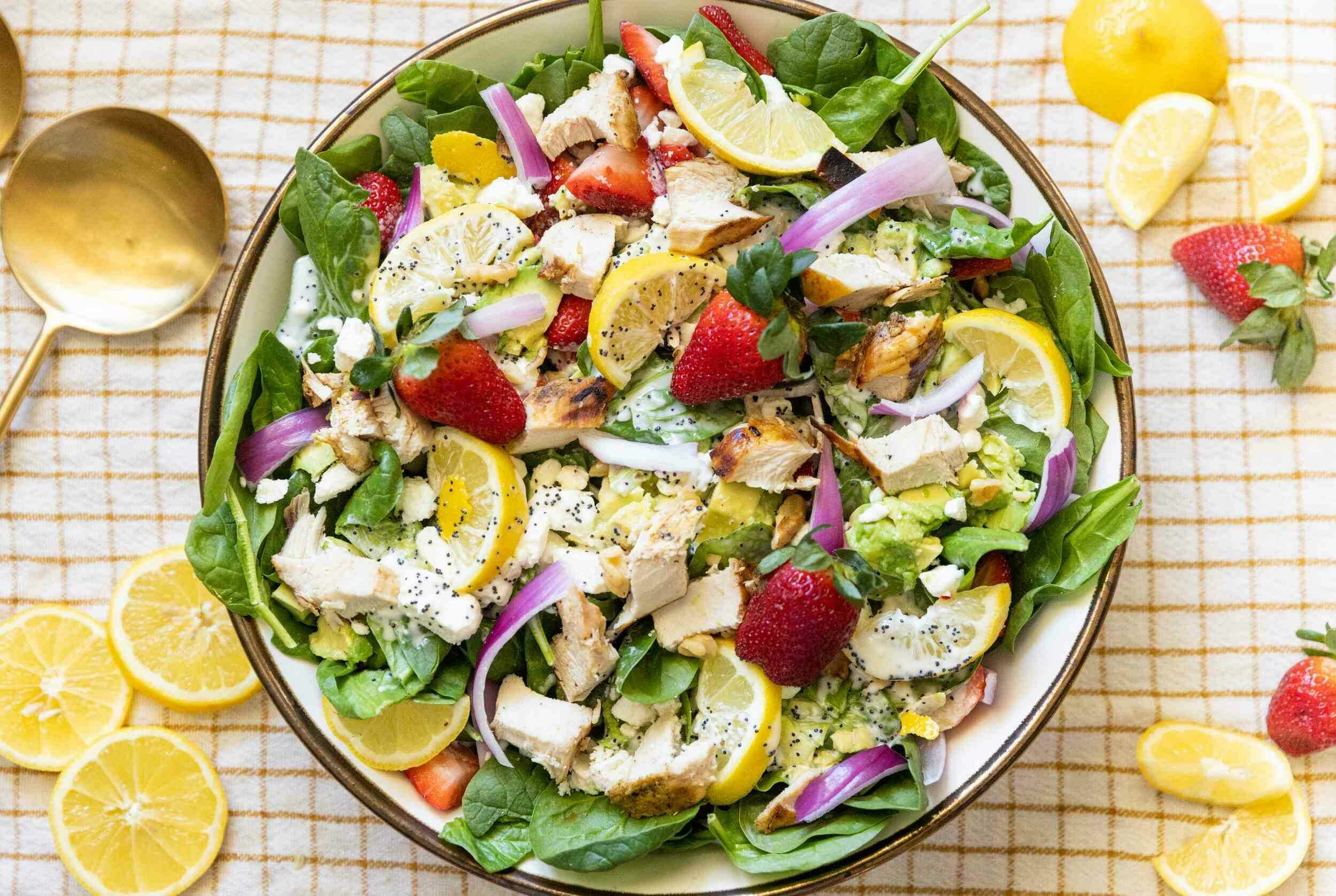 The most perfect warm-weather salad is here! Strawberry & Chicken Salad combines tender savory chicken breast, sharp feta cheese, and bright strawberries. Adorned with a citrusy, nutty, and fatty dressing, this salad looks as good as its taste. Strawberry & Chicken Salad only takes 30 minutes or less to make, so you can have it ready for a sunset dinner on the patio in no time!